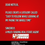 Dear Netflix, Please create a category called “Easy to follow whole looking at my phone the whole time.” Sincerely, A multi-tasking real estate agent That would be the be category ever! Lake Bishop – Broker Owner Foxtrot Realty 720-277-9219 [email protected] www.GreenValleyRanchRealEstateInfo.com #1 Selling agent in Green Valley Ranch Certified Military Residential Specialist #denverrealestate #denver #colorado… [Read More]
