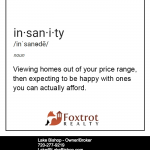 Insanity Viewing homes out of your price range, then expecting to be happy with ones you can actually afford. You should always get prequalified before looking for homes so you don’t fall in love with a home you can’t afford. I work with some great lenders let me know if you would like me to… [Read More]